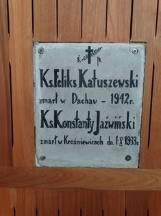 Tablica epitafijna z krośniewickiego kościoła poświęcona ks. F. Katuszewskiemu oraz ks. K. Jaźwińskiemu.